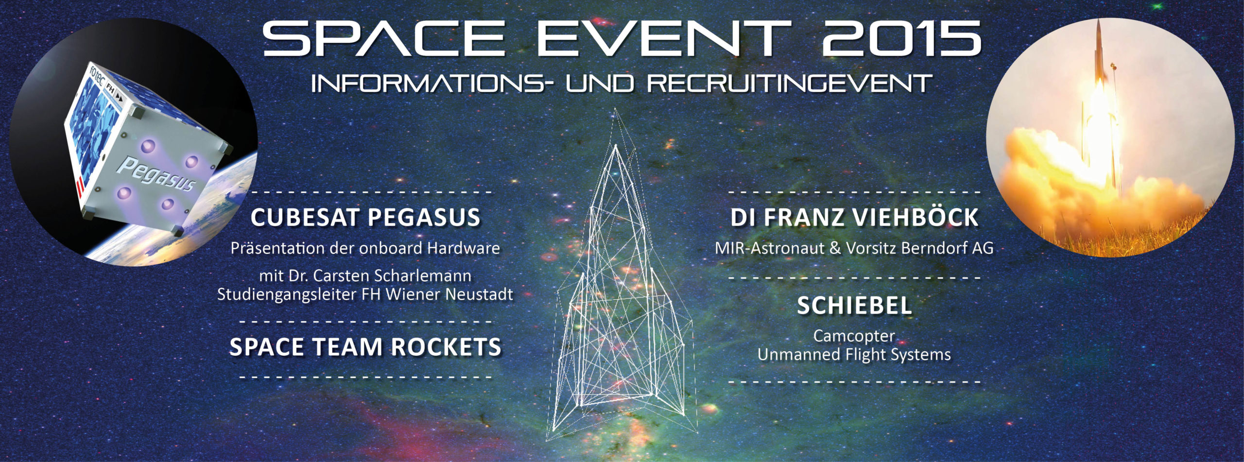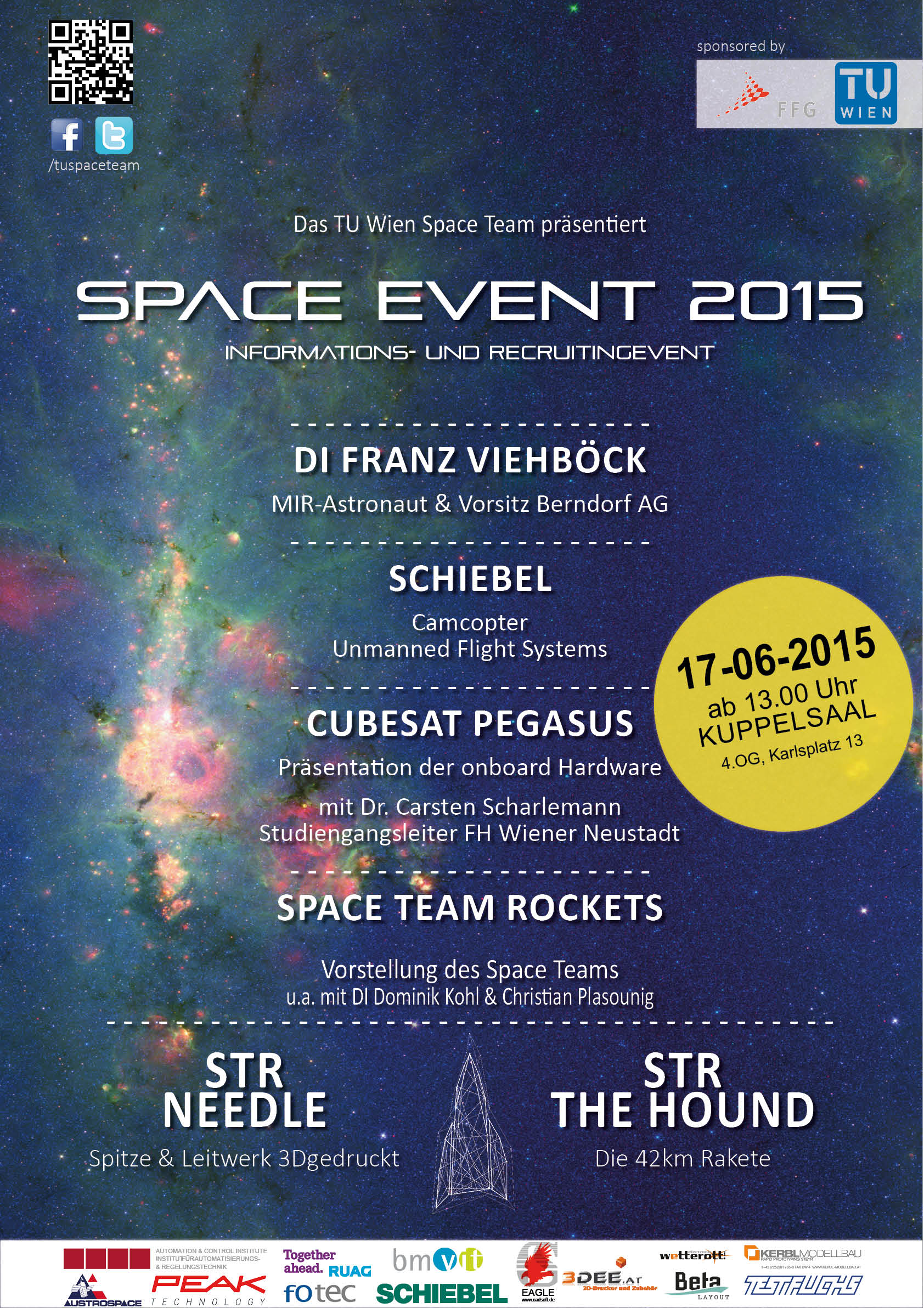 Nach dem Erfolg des Space Events 2014 organisiert das TU Wien Space Team auch dieses Jahr wieder eine Vortragsreihe namhafter Partner aus Luft- und Raumfahrttechnik und präsentiert darüber hinaus auch die Fortschritte im CubeSat-Projekt PEGASUS.