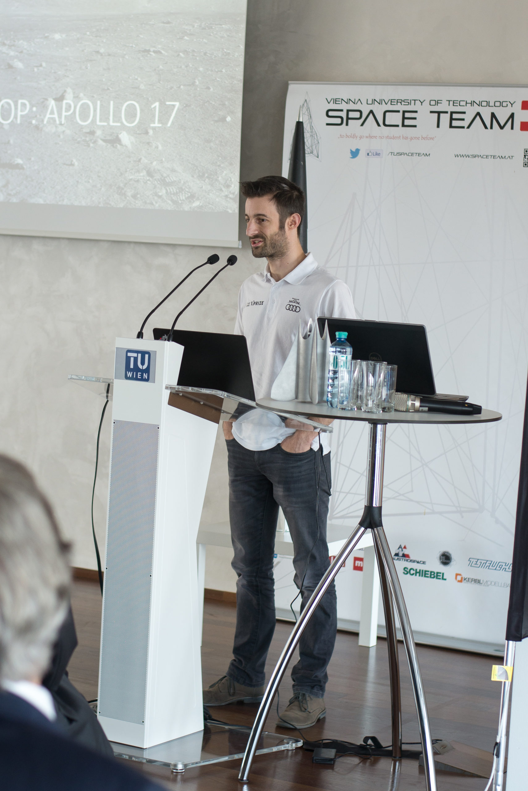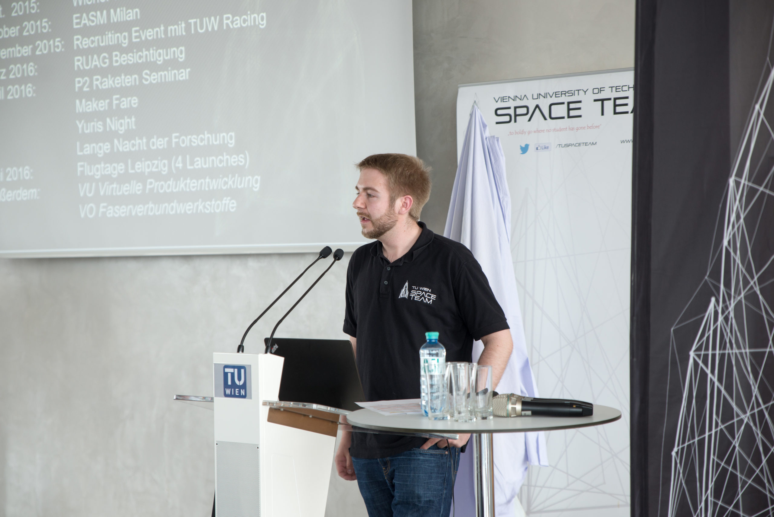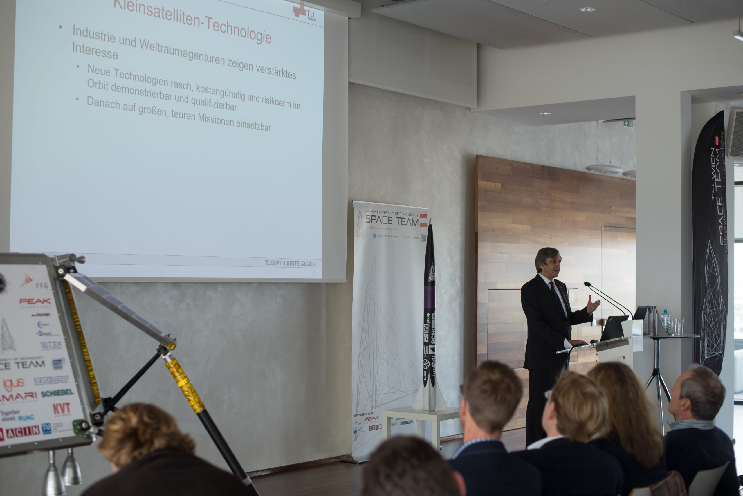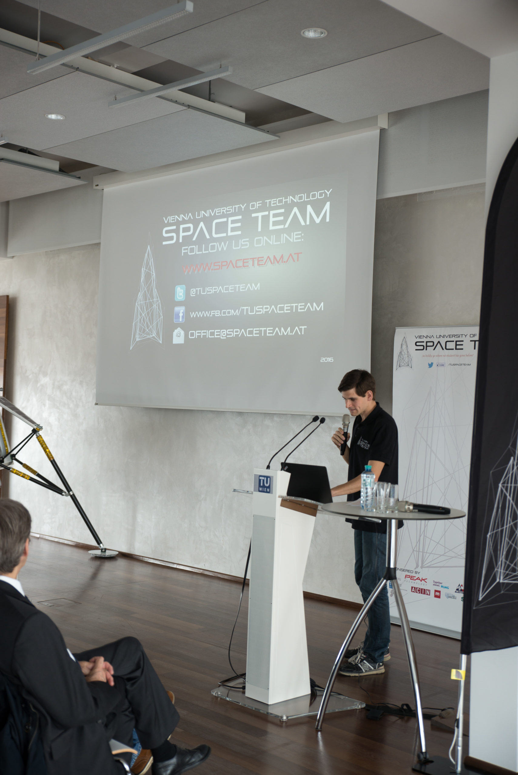 Gut 150 Besucher konnten im TUtheSky über den Dächern Wiens die Ausführungen der Gastredner Bastian Schäfer (Airbus), Prof. Otto Koudelka (TU Graz) und Thomas Schachner (Part Time Scientists) sowie die Präsentationen der Space Team Mitglieder mitverfolgen. Unter den Besuchern fanden sich neben Vertretern der TU Wien, wie Vizerektor Matyas und Vizerektor Fröhlich, sowie dem ehemaligen Vizerektor Prechtl auch der einzige österreichische Astronaut DI Franz Viehböck. Eine besondere Ehre war es auch den Raumfahrtmanager Prof. Johannes Ortner bei uns begrüßen zu dürfen. Zu den weitern Ehrengästen zählten Frau Michaela Gitsch von der FFG, Mag. Andreas Bauer vom Ars Electronica Center, Mag. Monika Fischer vom ÖWF, Dr. Martina Griesser-Stermscheg und Dr. Christian Klösch vom Technischen Museum sowie Dr. Kappl, der uns bei pyrotechnischen Belangen zur Seite steht.