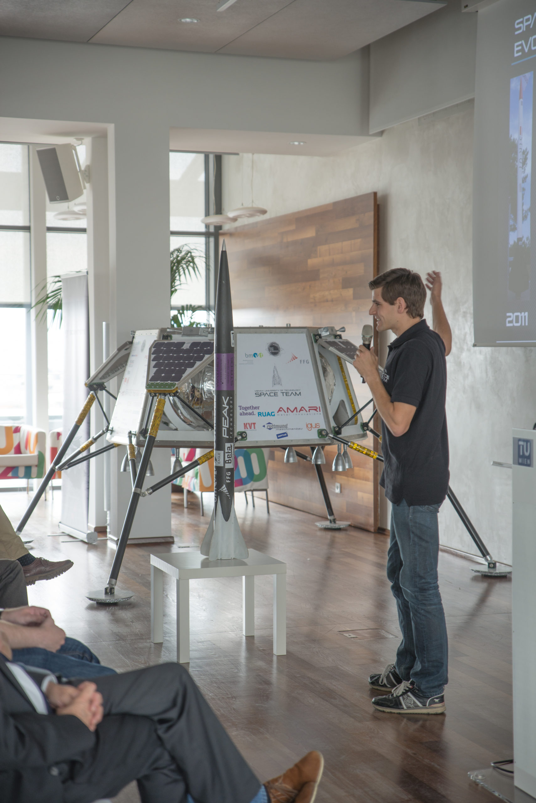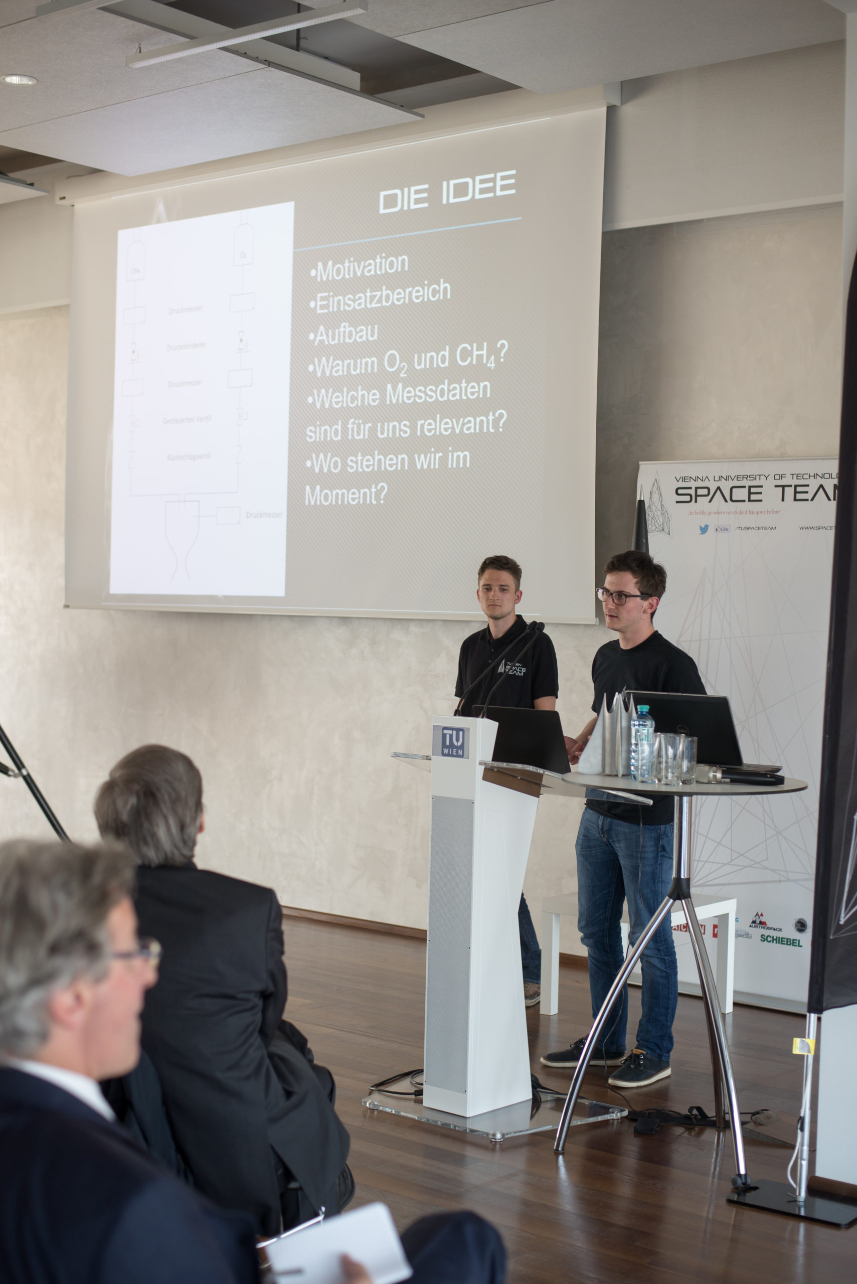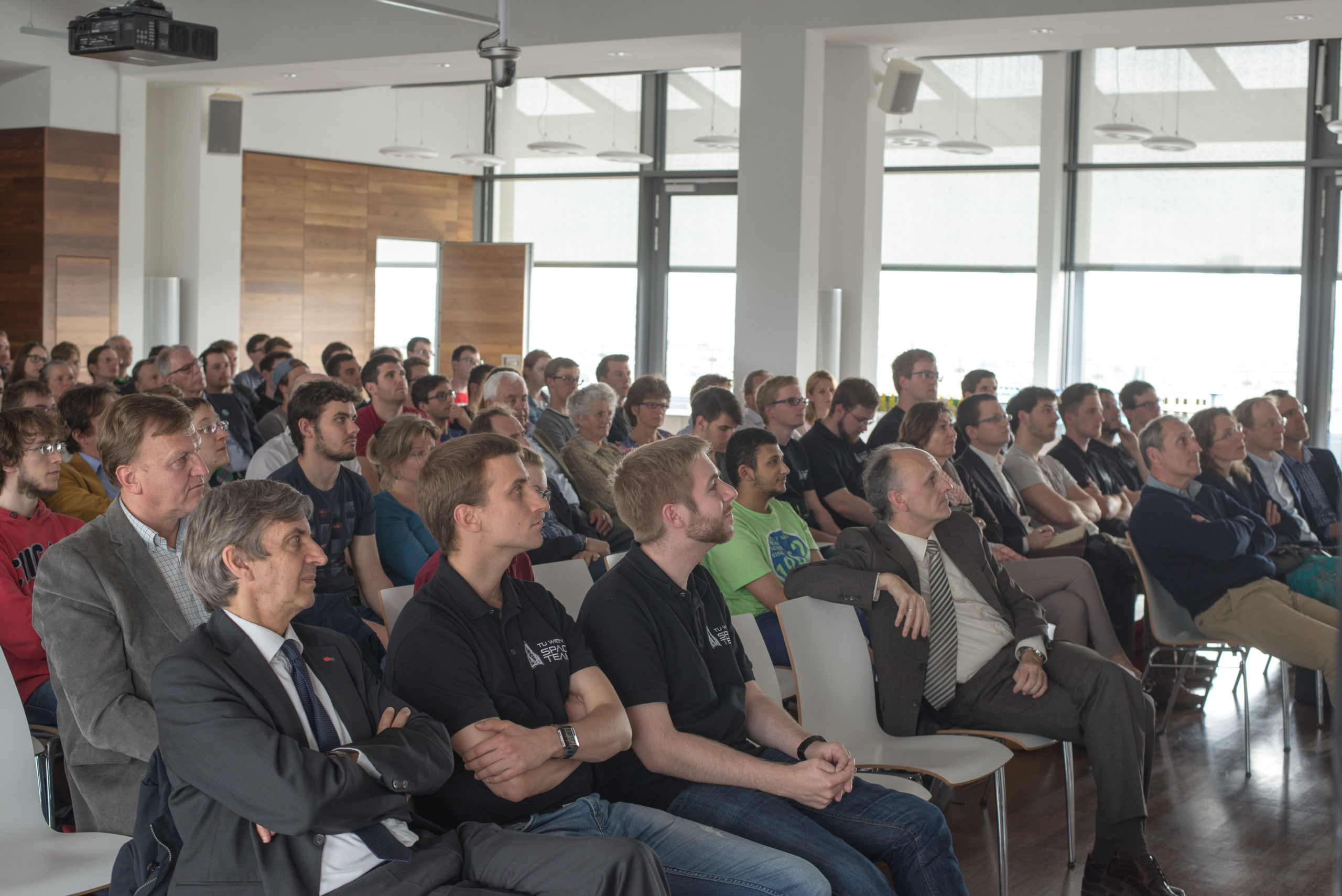 Gut 150 Besucher konnten im TUtheSky über den Dächern Wiens die Ausführungen der Gastredner Bastian Schäfer (Airbus), Prof. Otto Koudelka (TU Graz) und Thomas Schachner (Part Time Scientists) sowie die Präsentationen der Space Team Mitglieder mitverfolgen. Unter den Besuchern fanden sich neben Vertretern der TU Wien, wie Vizerektor Matyas und Vizerektor Fröhlich, sowie dem ehemaligen Vizerektor Prechtl auch der einzige österreichische Astronaut DI Franz Viehböck. Eine besondere Ehre war es auch den Raumfahrtmanager Prof. Johannes Ortner bei uns begrüßen zu dürfen. Zu den weitern Ehrengästen zählten Frau Michaela Gitsch von der FFG, Mag. Andreas Bauer vom Ars Electronica Center, Mag. Monika Fischer vom ÖWF, Dr. Martina Griesser-Stermscheg und Dr. Christian Klösch vom Technischen Museum sowie Dr. Kappl, der uns bei pyrotechnischen Belangen zur Seite steht.
