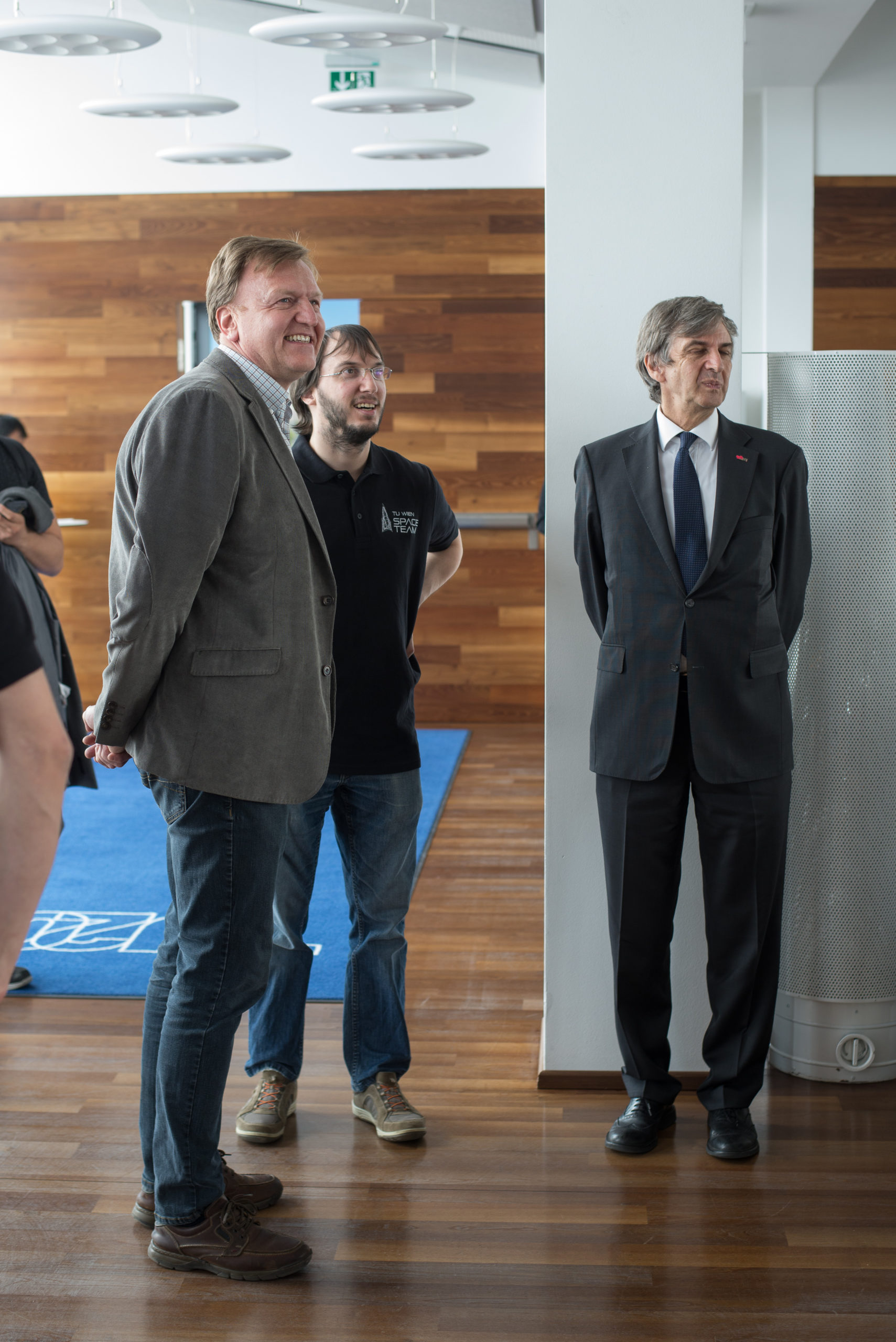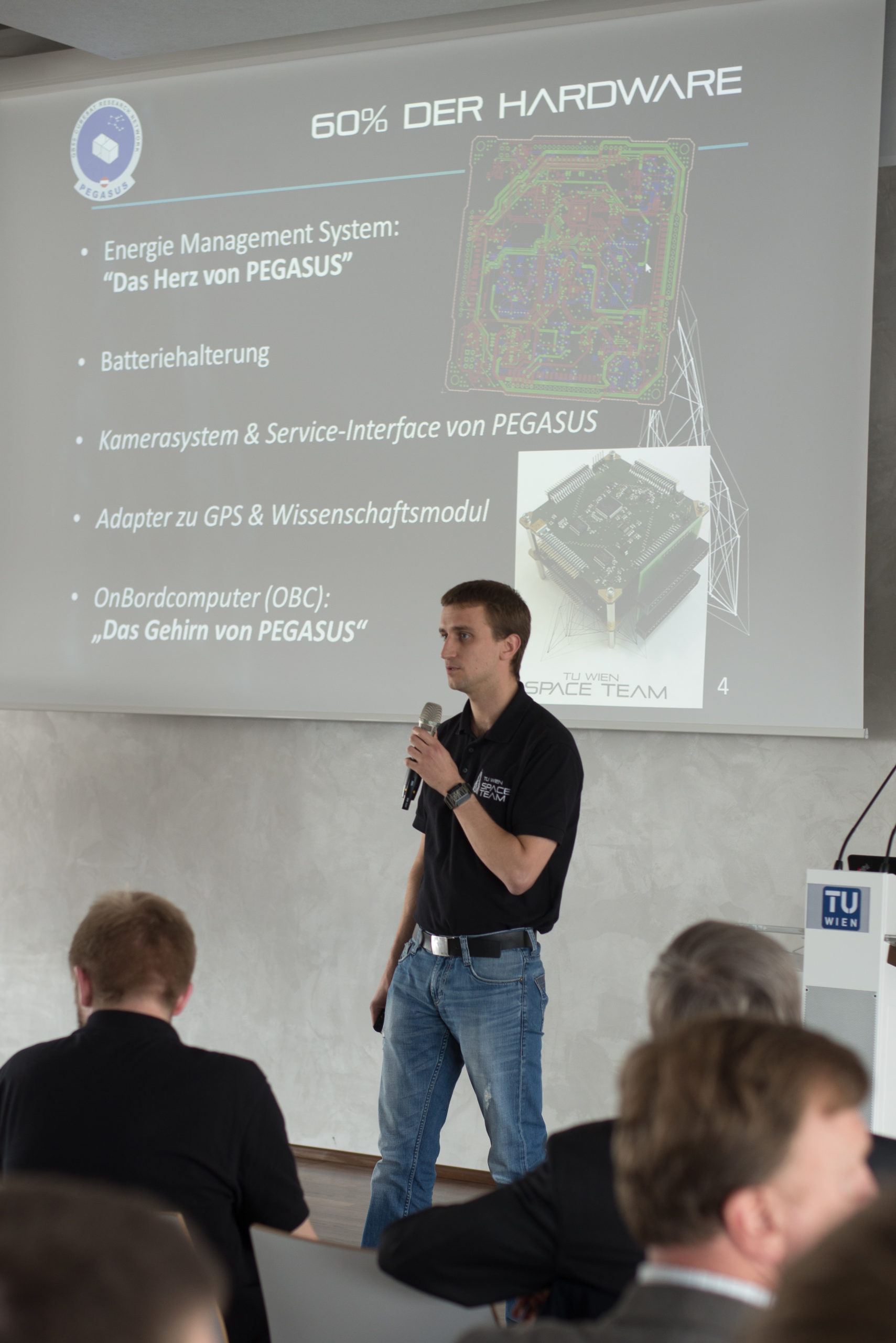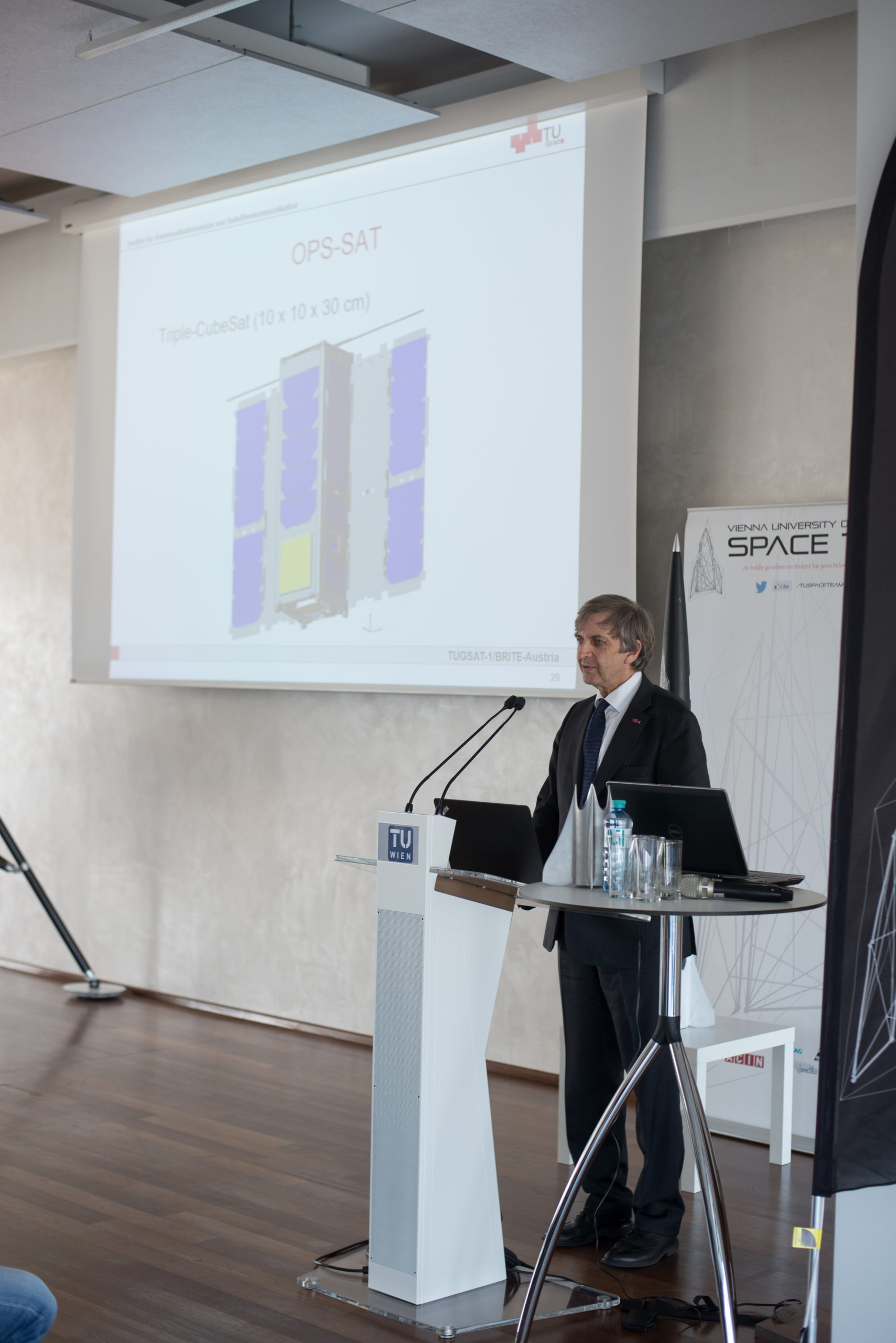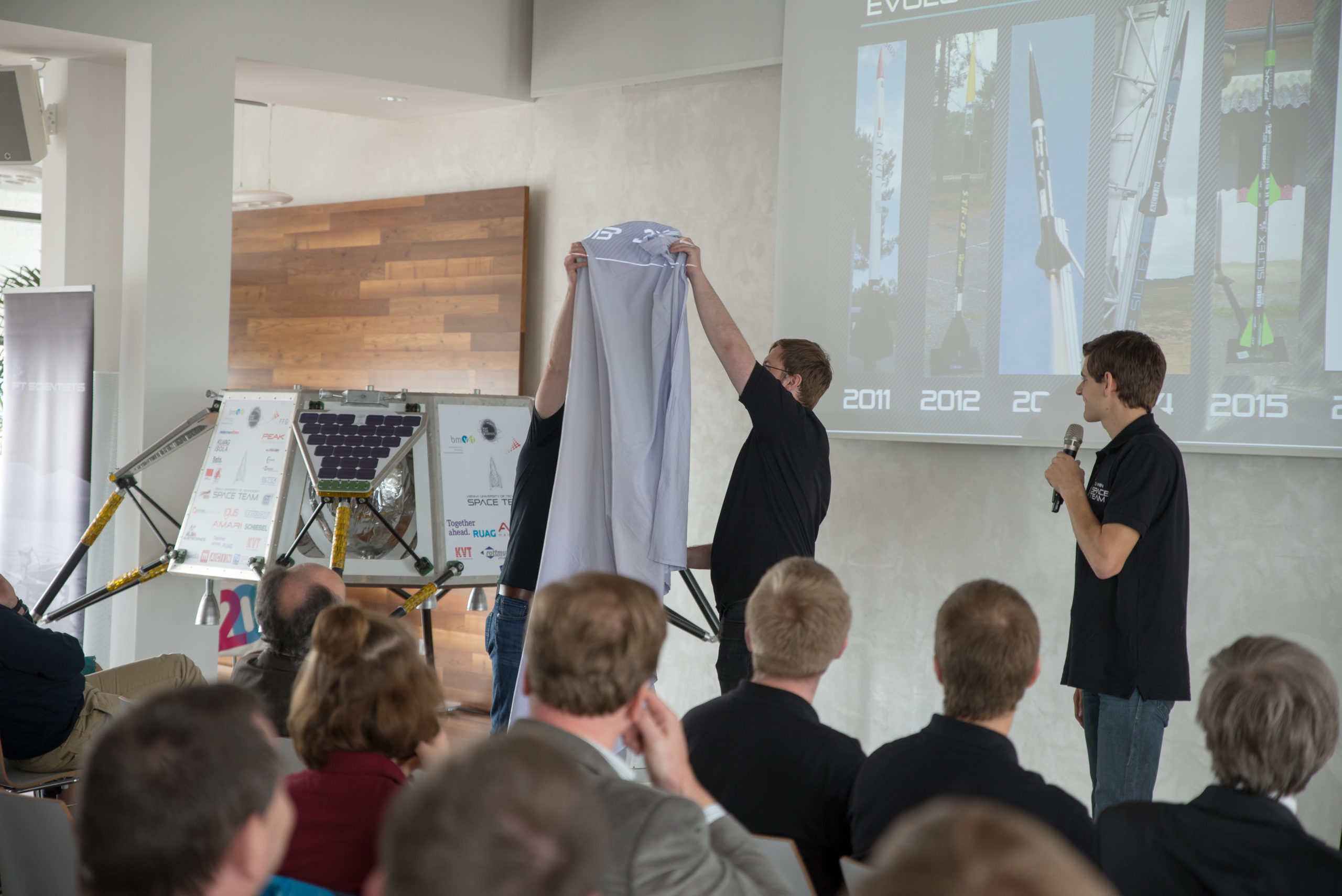 Gut 150 Besucher konnten im TUtheSky über den Dächern Wiens die Ausführungen der Gastredner Bastian Schäfer (Airbus), Prof. Otto Koudelka (TU Graz) und Thomas Schachner (Part Time Scientists) sowie die Präsentationen der Space Team Mitglieder mitverfolgen. Unter den Besuchern fanden sich neben Vertretern der TU Wien, wie Vizerektor Matyas und Vizerektor Fröhlich, sowie dem ehemaligen Vizerektor Prechtl auch der einzige österreichische Astronaut DI Franz Viehböck. Eine besondere Ehre war es auch den Raumfahrtmanager Prof. Johannes Ortner bei uns begrüßen zu dürfen. Zu den weitern Ehrengästen zählten Frau Michaela Gitsch von der FFG, Mag. Andreas Bauer vom Ars Electronica Center, Mag. Monika Fischer vom ÖWF, Dr. Martina Griesser-Stermscheg und Dr. Christian Klösch vom Technischen Museum sowie Dr. Kappl, der uns bei pyrotechnischen Belangen zur Seite steht.