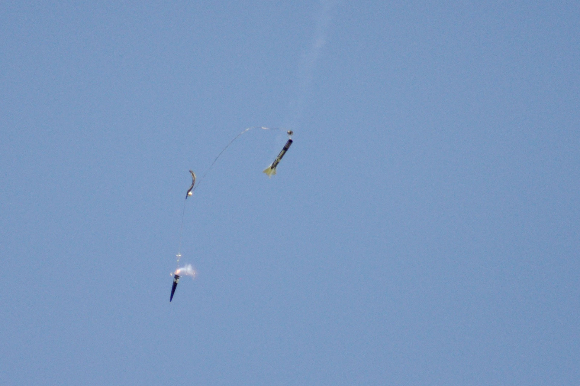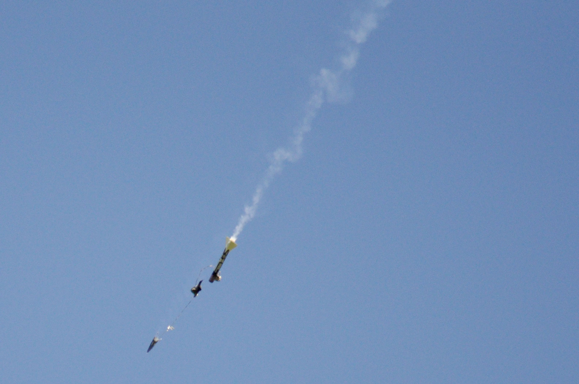 Für diesen ersten Test wurde in der Oberstufe ein Motor mit geringem Impuls gewählt, was jedoch ausreicht um ein Proof-Of-Concept zu liefern. Der Oberstufenmotor wurde von unserer Boardelektronik wenige Sekunden nach der erfolgreichen Stufentrennung gezündet, wie man gut vom Boden aus beobachten konnten.
