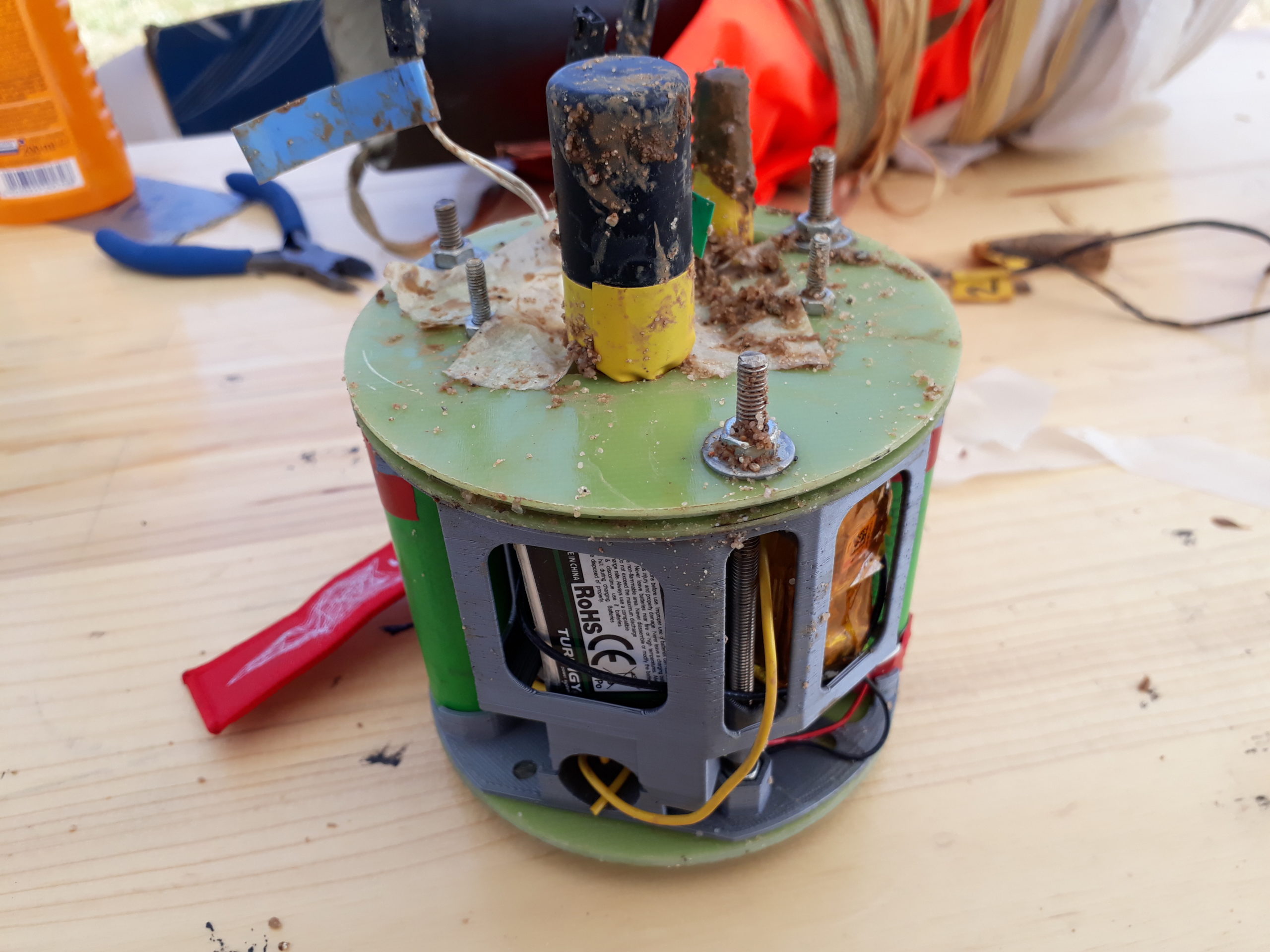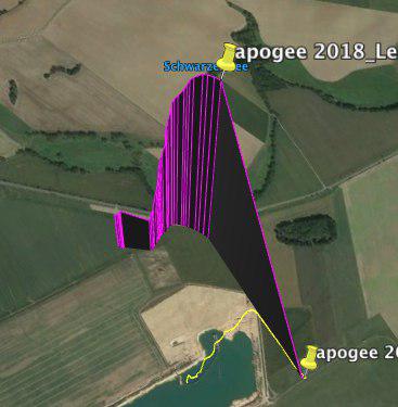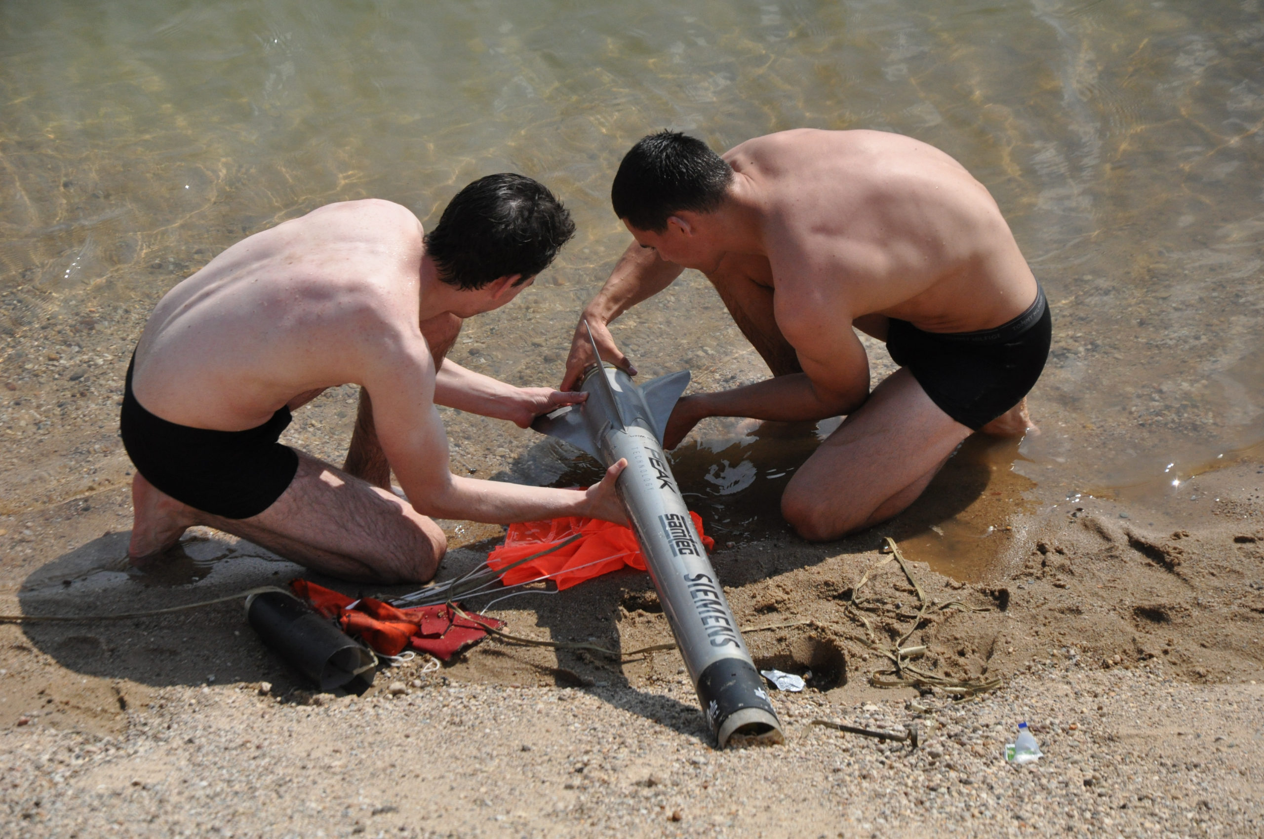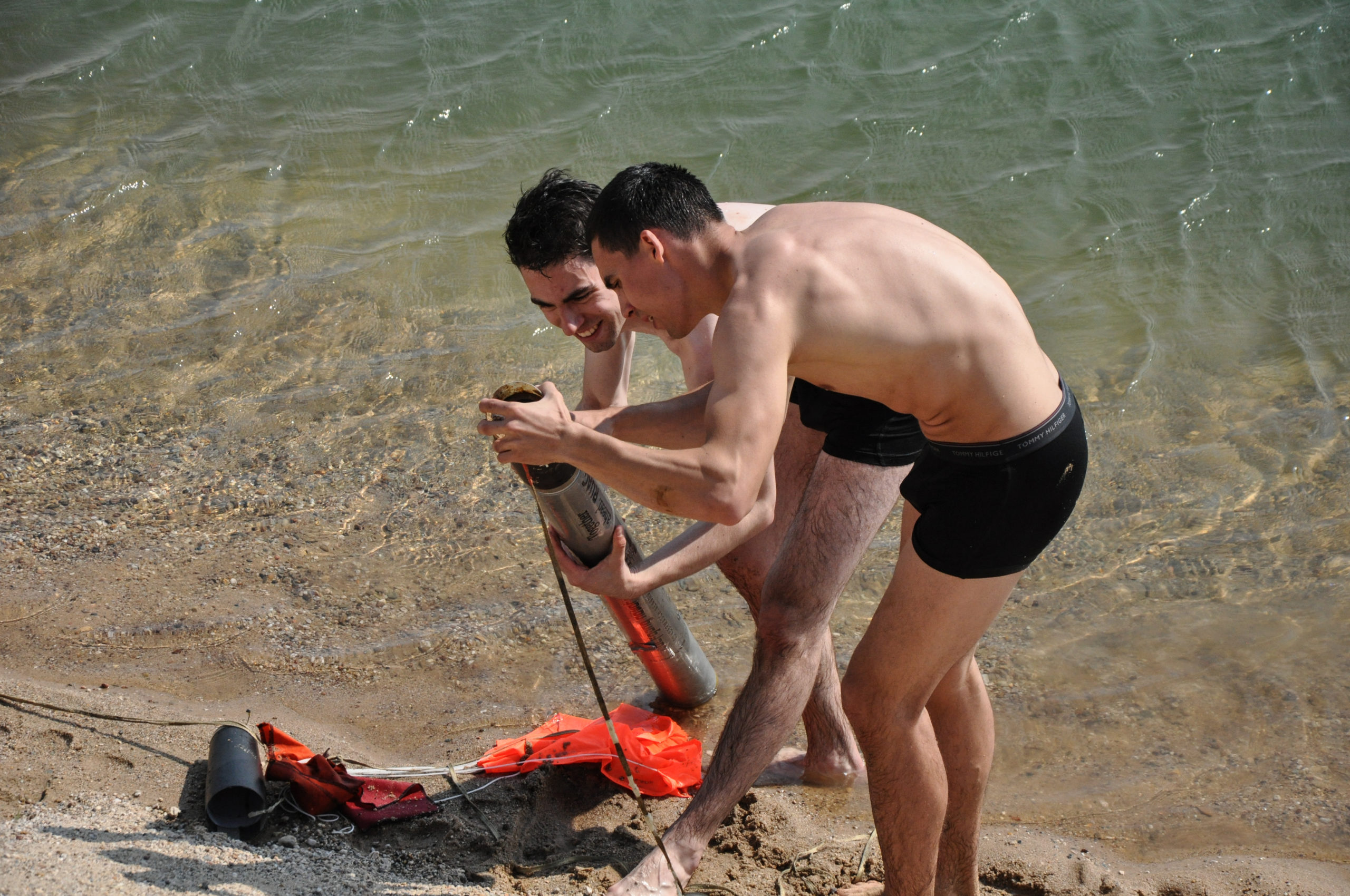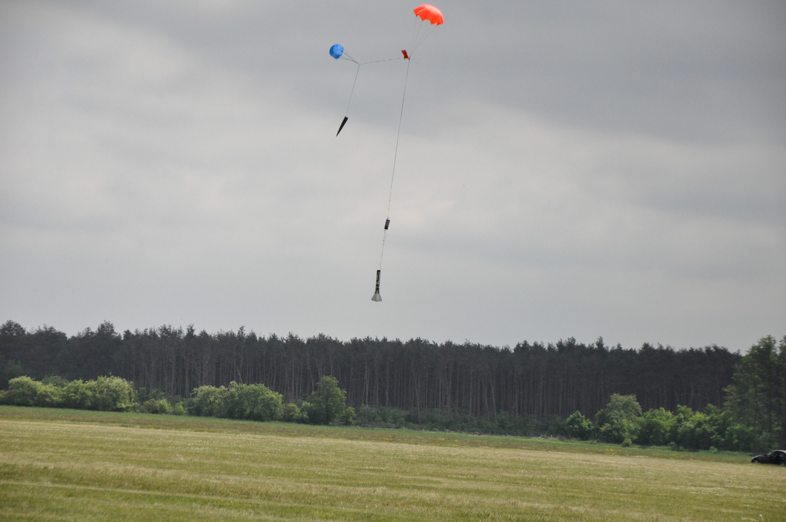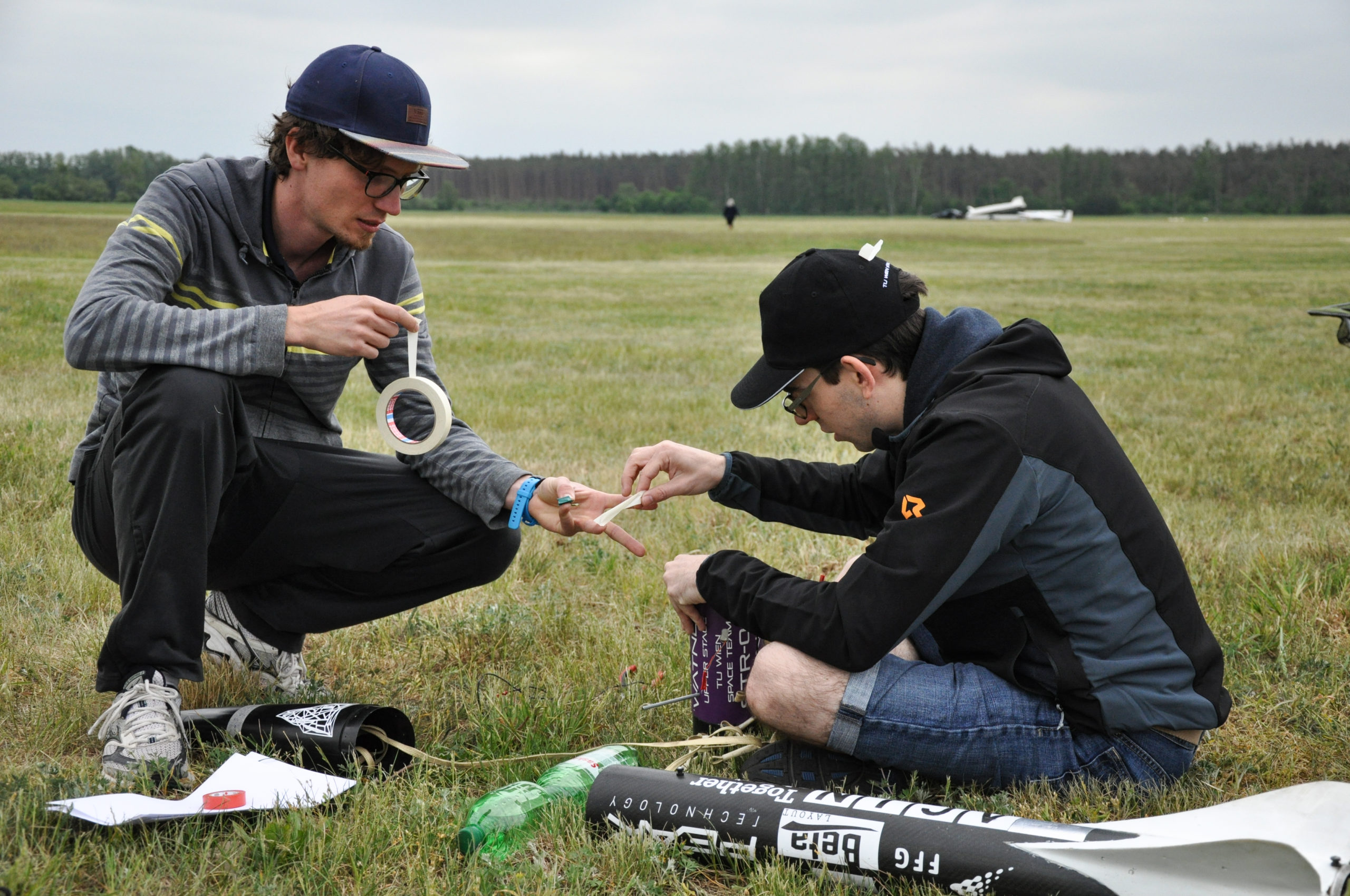 Die ungünstigen Windverhältnisse lenkten die Unterstufe in die Nähe des angrenzenden Baggersees, in dem sie kurze Zeit später auch versank. Nun gab es keine Zeit zu verlieren! Zwei tüchtige Team-Mitglieder eilten zum Ufer und konnten den Booster gerade noch rechtzeitig aus dem Wasser bergen. Der Zustand, vor allem der der Elektronik, war, trotz der Wasserlandung, überraschend gut und ließ die Auswertung der Flugdaten zu.