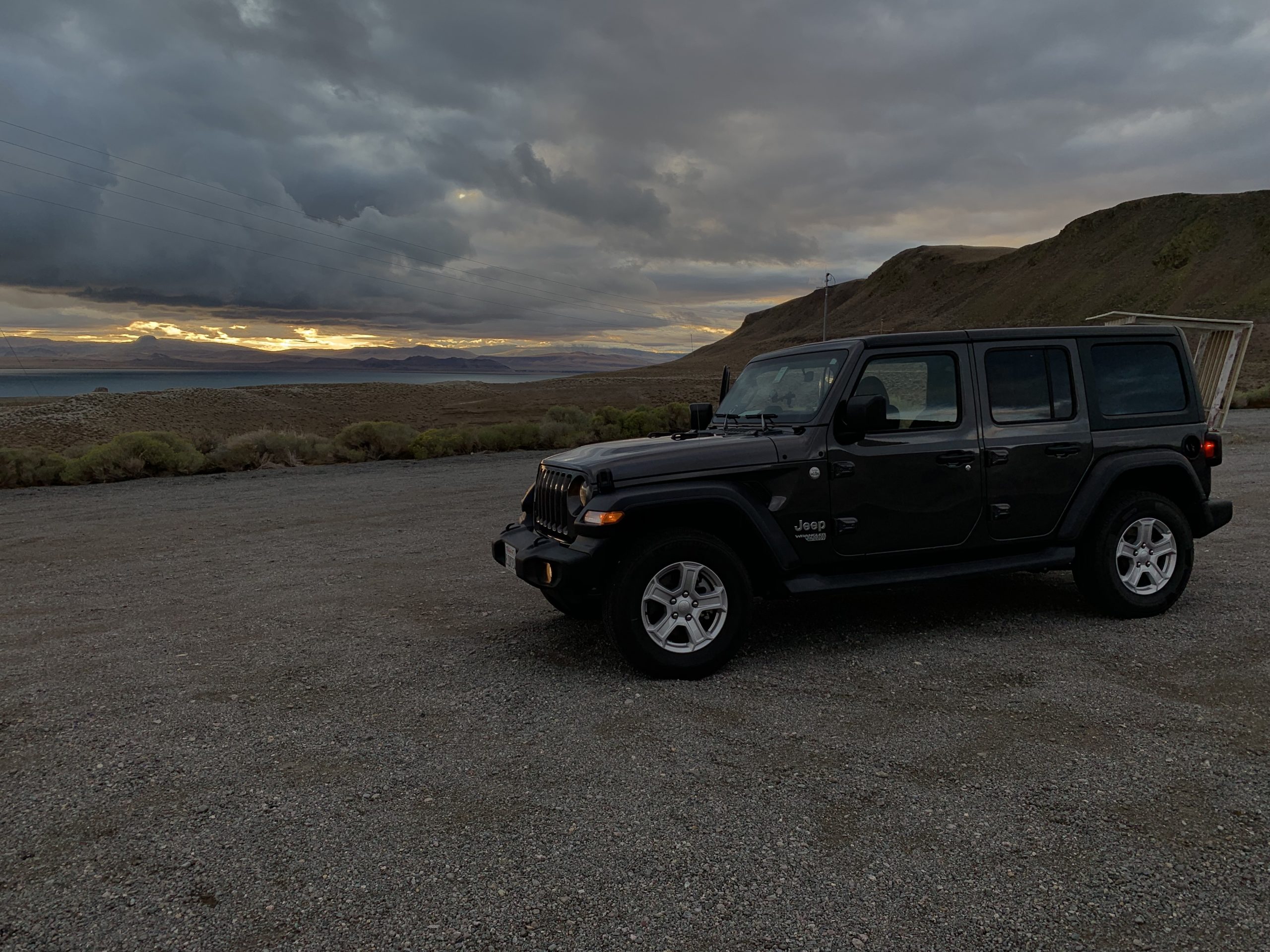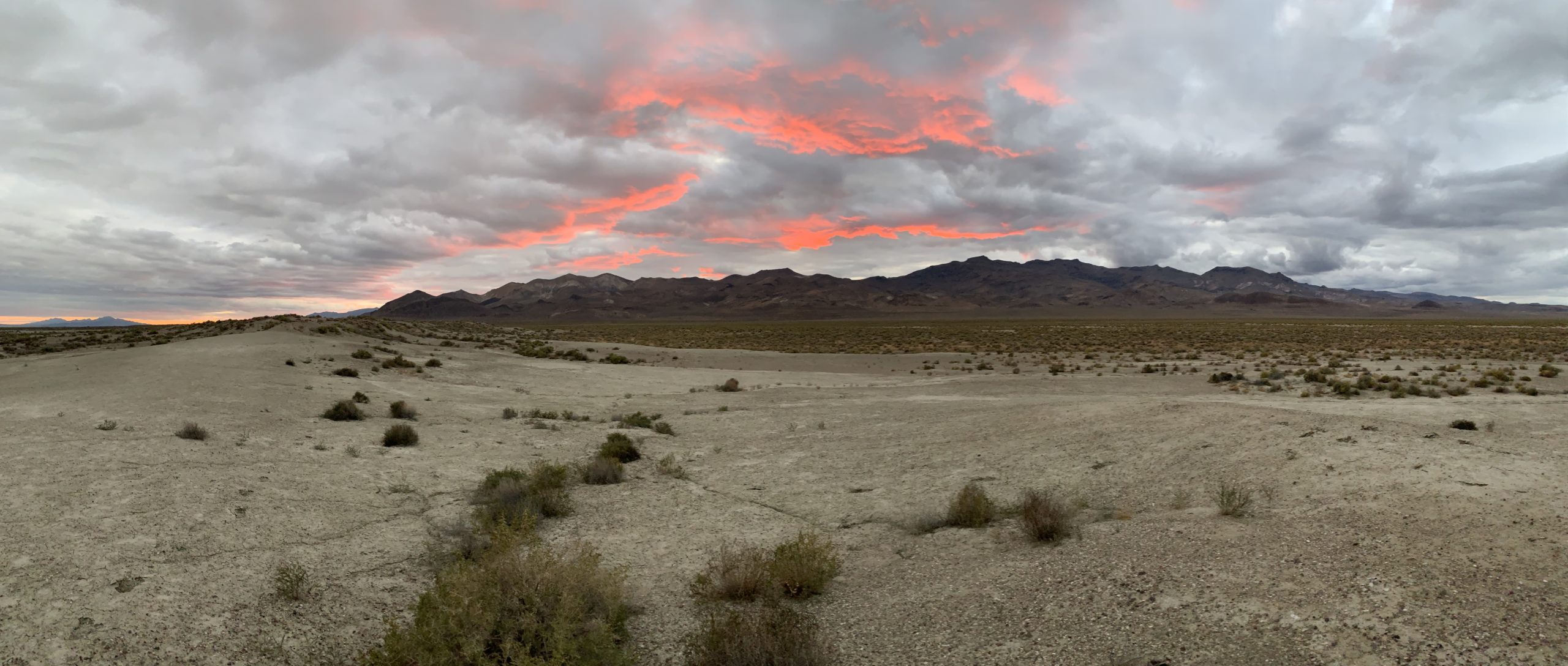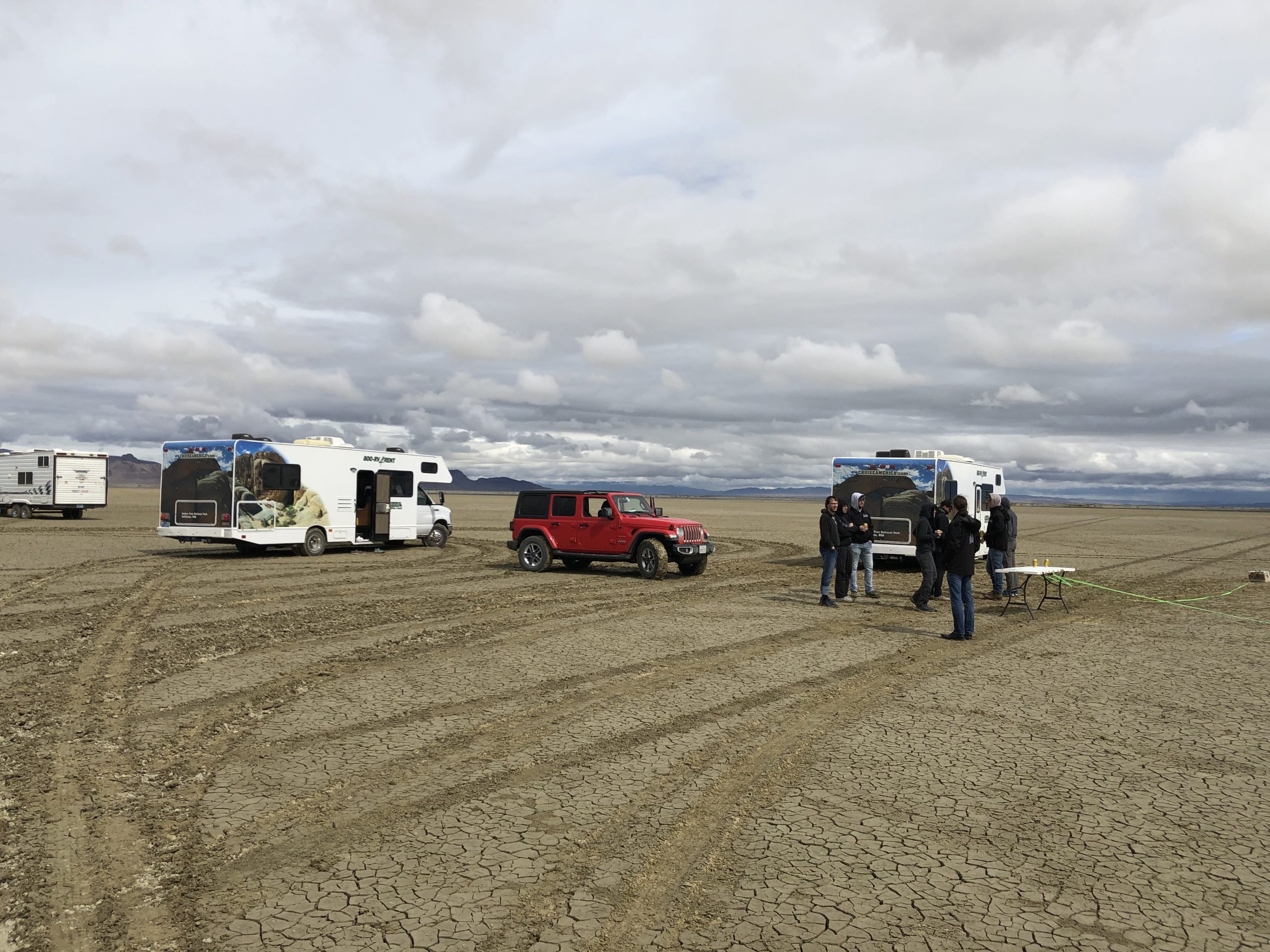 Der Rest des Teams machte sich im Lauf des Vormittags auf den Weg nach Gerlach – das letzte bisschen Zivilisation vor der Wüste. Tief hängende Wolken und unterwegs immer wieder auftretende Regenschauer drückten die Stimmung und ließen uns an der Möglichkeit die Wüste überhaupt zu befahren zweifeln. Der sandige Boden der Playa – ein ausgetrockneter Salzsee und gleichzeitig Austragungsort von BALLS – ist nämlich bei Nässe für schwere Fahrzeuge wie unsere RVs gänzlich unbefahrbar. Wir entschieden uns trotzdem den Versuch zu wagen und hatten Glück, dass die Feuchtigkeit nur ein oberflächliches Problem war.