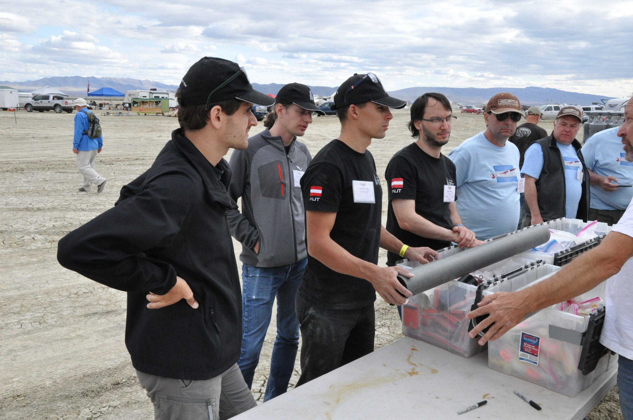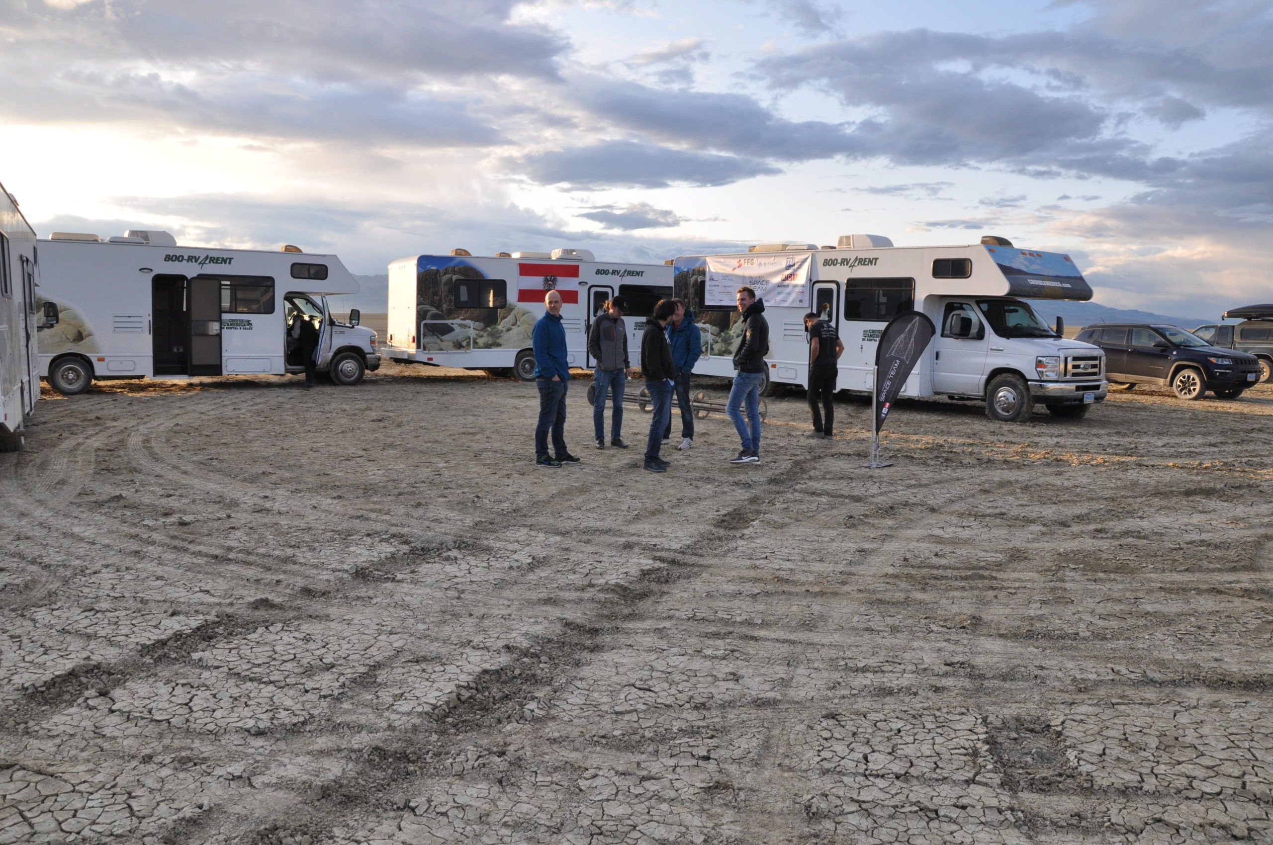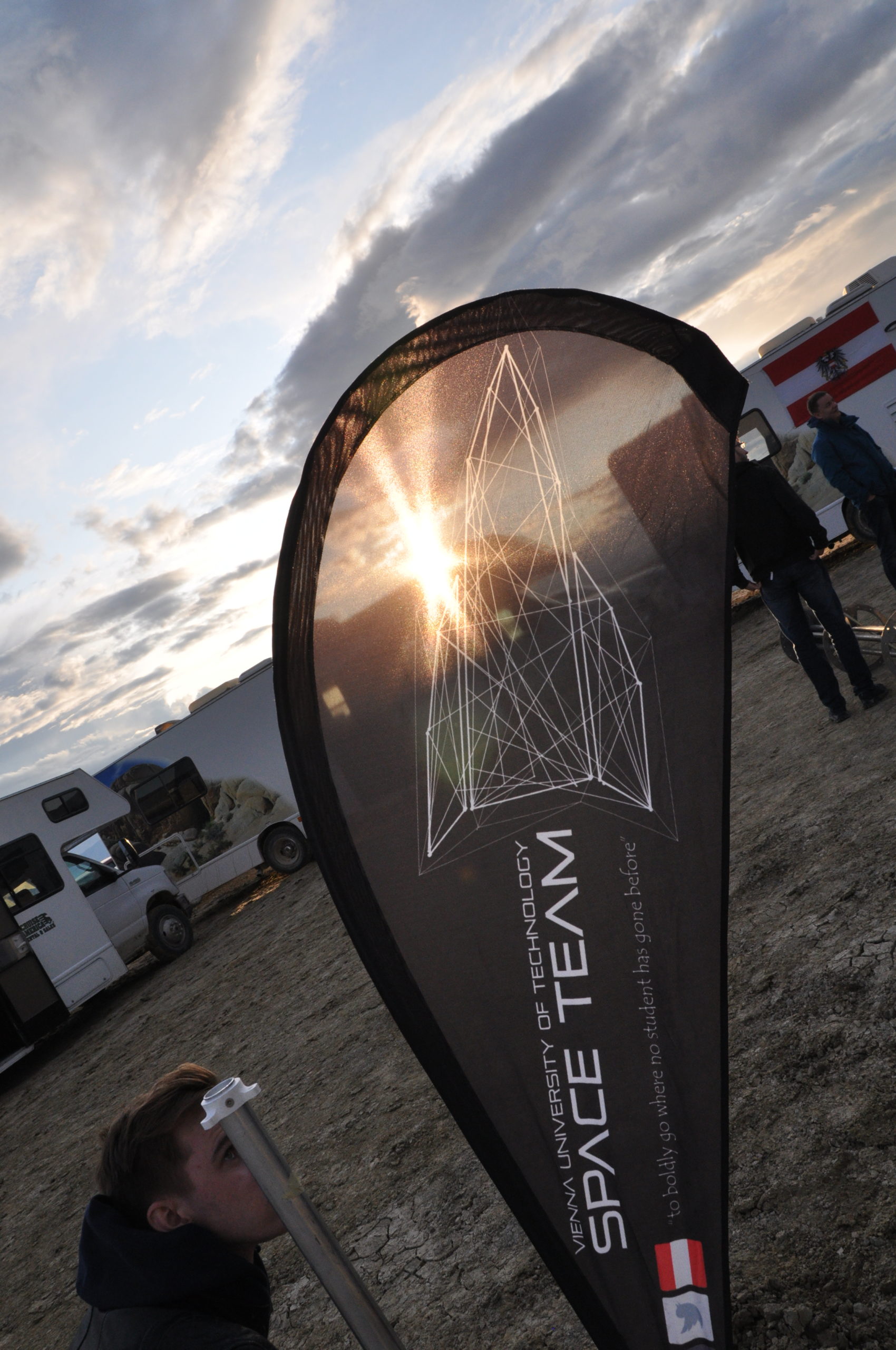 Als wir das provisorische Camp in Sichtweite des namensgebenden Black Rock erreichten begannen wir sofort damit unsere vier mobilen Heime zu einem kleinen Lager zu gruppieren. Im “Innenhof” unserer Wagenburg platzierten wir ein paar Sitzgruppen, an die Seiten hängten wir die österreichische Flagge und unser Sponsorenbanner und darüber improvisierten wir einen Sonnenschutz. Danach bauten wir die Startrampe zusammen und versuchten unsere Raketen – bis auf den Einbau der Motoren – zu finalisieren.