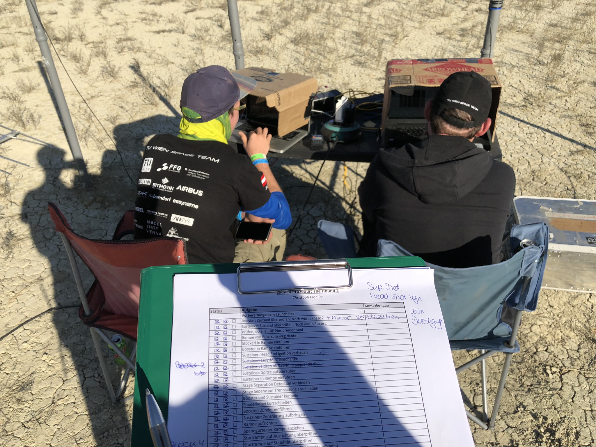 Alle Systeme auf GO, letzte Infos an den Liveticker in der Heimat, Startfreigabe durch den Launch Control Officer und dann über den Camp-Funk die erhebenden Worte: “Heads up for the Austrian space shot!”