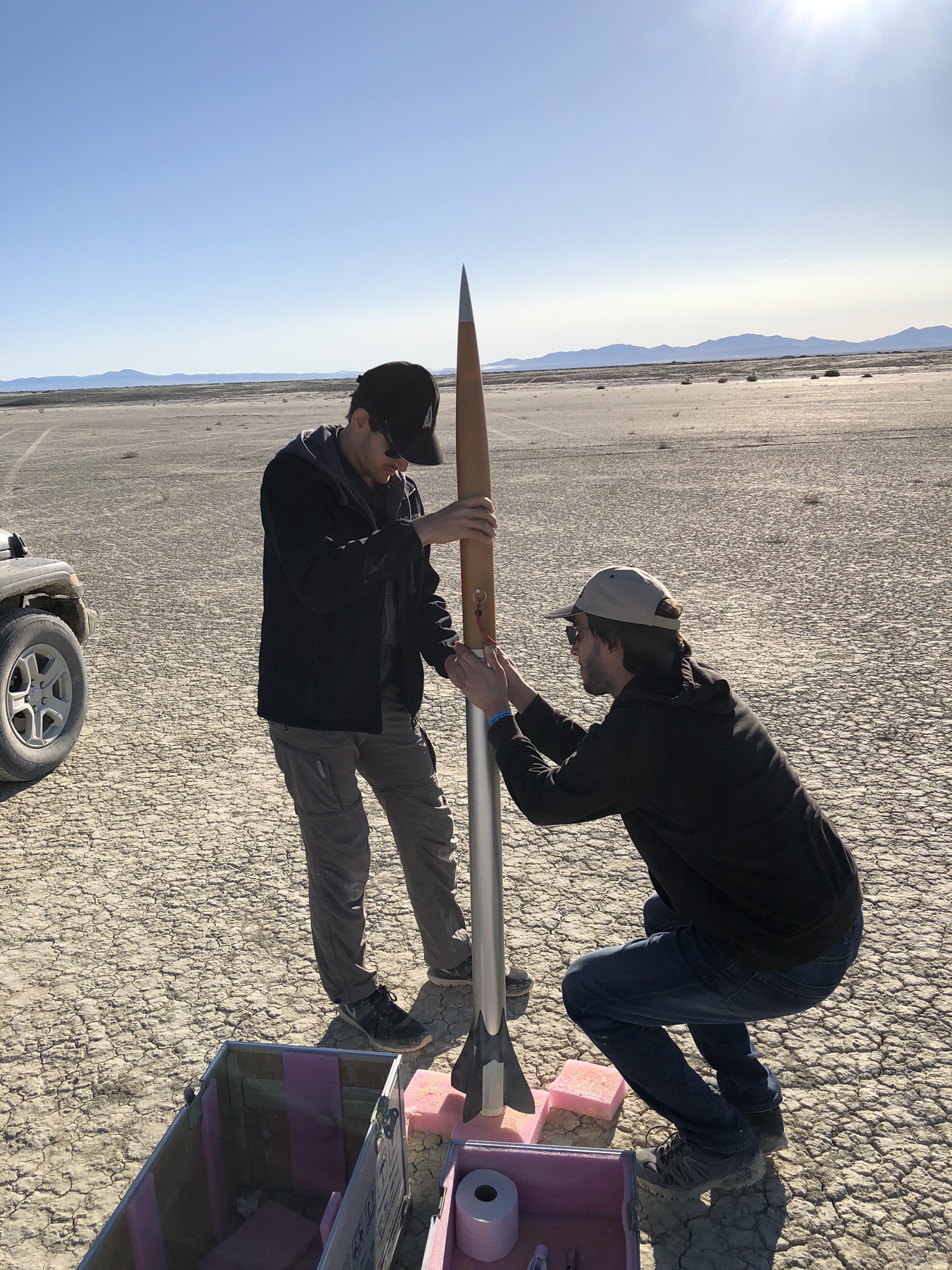 Am Folgetag, dem Mittwoch, verdüsterte sich der Ausblick aufs Wochenende dann jedoch vollends: Von den zwei bestellten N5800 Motoren war nur einer verfügbar, und der sollte erst am Freitag direkt in die Wüste geliefert werden. Unser Plan – am Freitag bereits die erste Rakete gestartet und geborgen zu haben – war somit endgültig hinfällig.