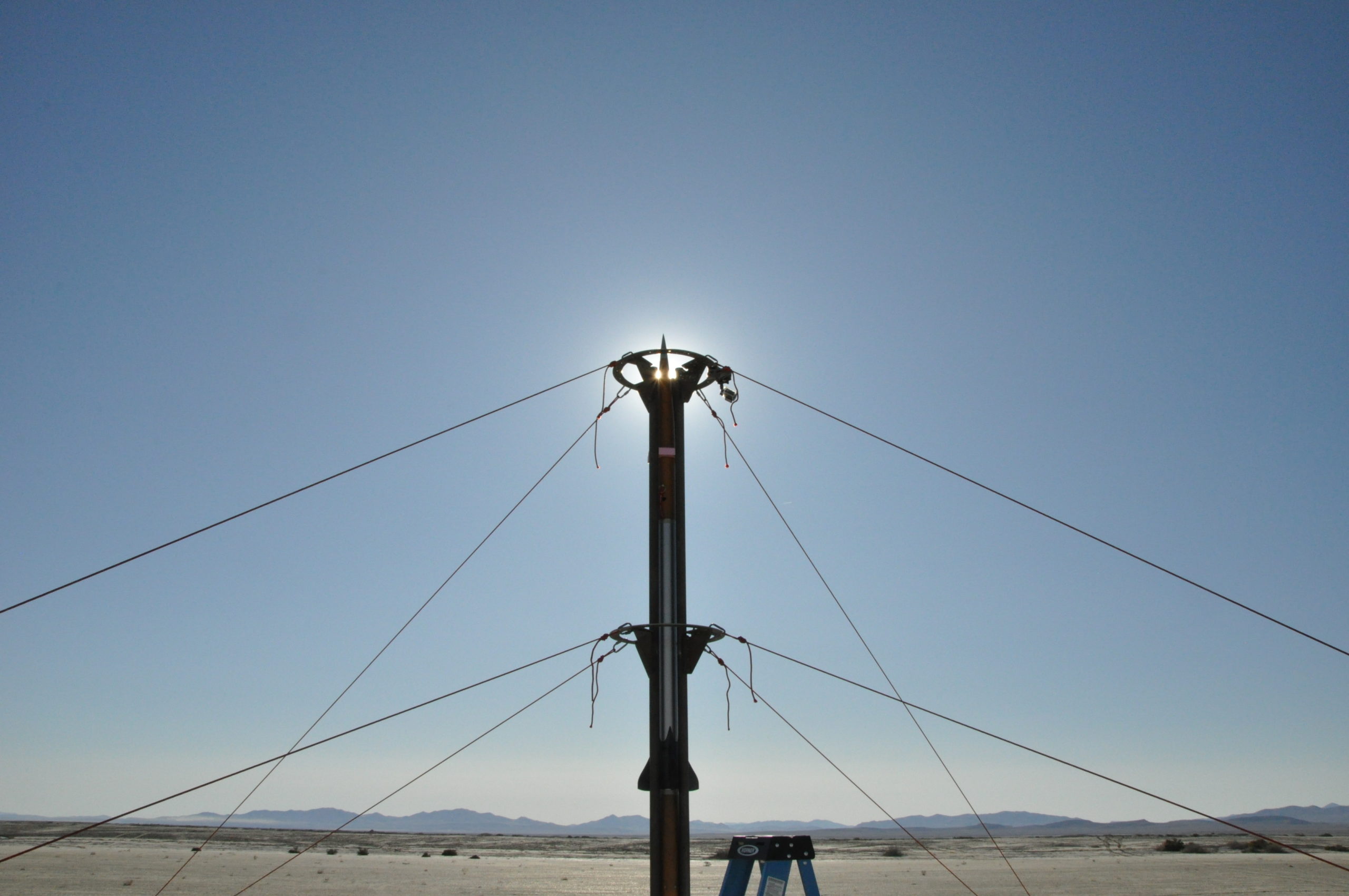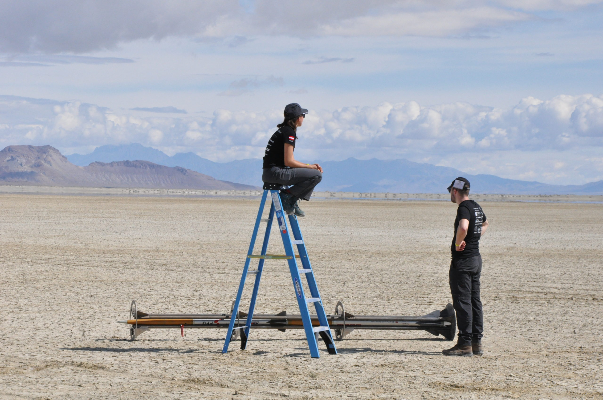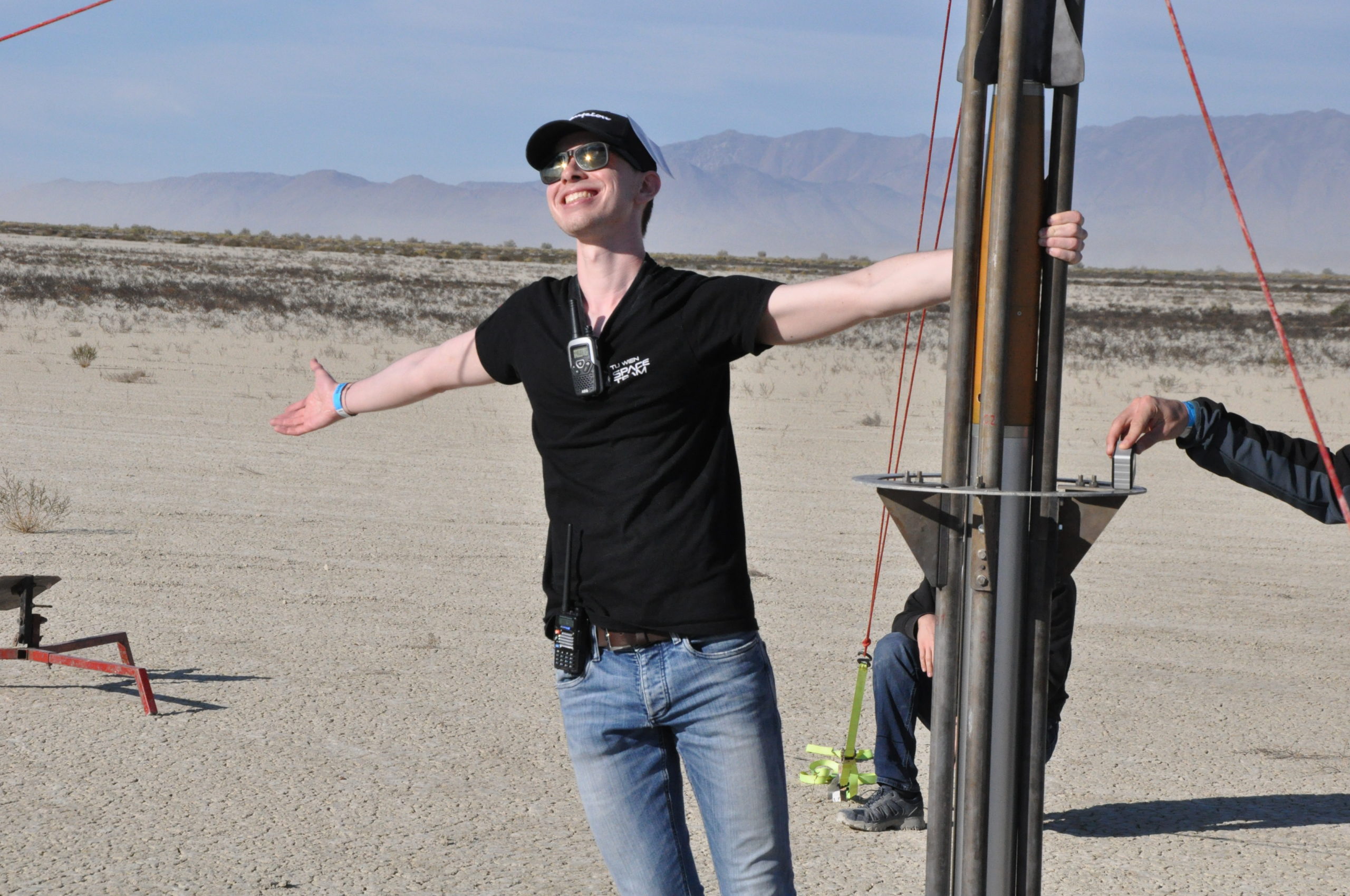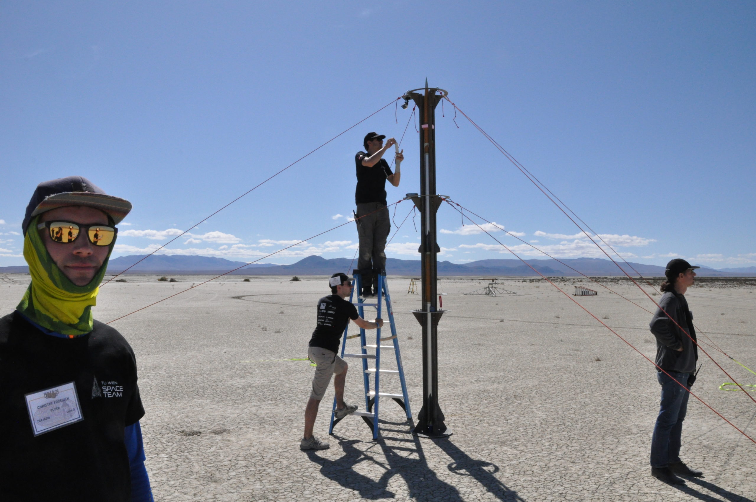 Endlich konnten wir den Rekordversuch wagen! Die furchtbare Kälte, die die Wüste nachts im Griff hat, konnte uns nichts anhaben: Voller Elan bauten wir die Startrampe auf dem eine Meile entfernten Launchpad auf. Während die Sonne wie jeden Tag wieder an Kraft gewann und immer unbarmherziger auf uns herab brannte brachten wir den startbereiten “The Hound 2” hinaus auf die Playa. Das Launch Procedure wurde konzentriert abgearbeitet und die Aufregung stieg mit jeder Minute. Die Kameras wurden positioniert, der Liveticker mit aktuellsten Updates versorgt. Nicht mehr lange und das TU Wien Space Team sollte Richtung Weltall abheben!