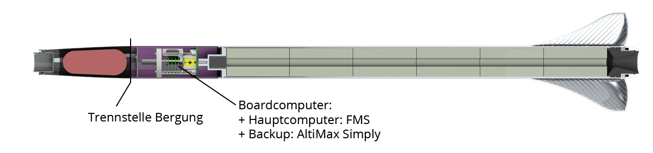 Die Bergung der Unterstufe wird vom baugleichen FMS initiiert. Als Backup dient hier ein Altimax Simply von rocketronics.de.