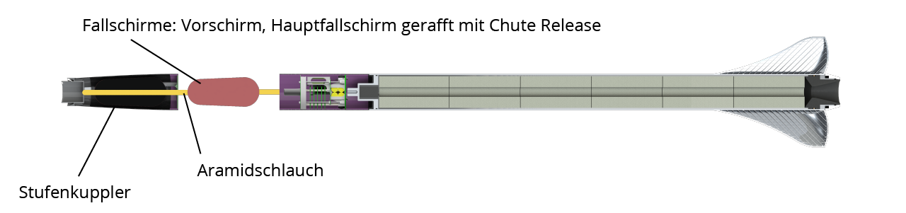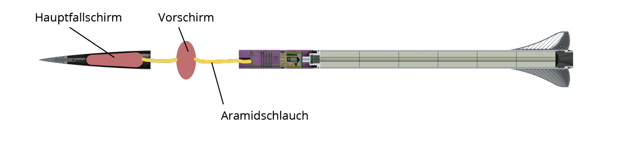 Beide Teile sind mit einem Aramidschlauch verbunden, an dem auch der Vorschirm befestigt ist. Dieser soll die Rakete beim Wiedereintritt in die Atmosphäre stabilisieren und die Rakete abbremsen bevor der Hauptfallschirm geöffnet wird. Dieser wird in der Raketenspitze zurückgehalten und erst auf einer bestimmten Höhe von einem CYPRES linecutter, ausgelöst von einem Altus Metrum EasyMini freigegeben.