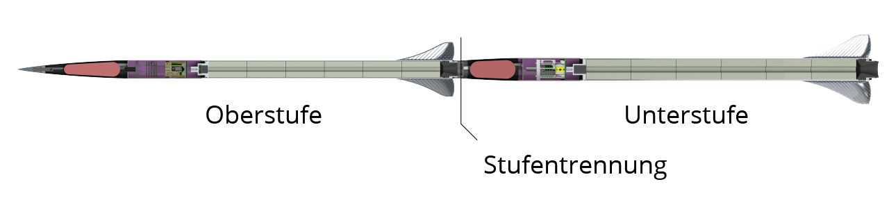 - Durch die fehlerhafte Erkennung des Gipfelpunktes durch den Backupcomputer Altimax (s.o.) wird bei ca T=3.5s die Unterstufe an der Trennstelle der Bergung getrennt. Der Stufenkuppler ist zu dem Zeitpunkt noch mit der Oberstufe verbunden. Aufgrund der hohen Geschwindigkeit (Mach 2.4) wird der Fallschirm nicht ausgeworfen, sondern der Aramidschlauch, welcher die Unterstufe mit dem Kuppler verbindet, sofort abgerissen. Dabei erfährt die Oberstufe eine radiale Kraft und somit nennenswertes Drehmoment, was zu einer Lageänderung bzw. Erhöhung des Anstellwinkels führt. Schlussendlich bricht die mechanische Struktur aufgrund des hohen Biegemomentes. Da der Stufenkuppler im Steigflug der Unterstufe bereits fehlte, verringerte sich die Höhe des Gipfelpunktes der Unterstufe aufgrund des erhöhten Luftwiderstandes.