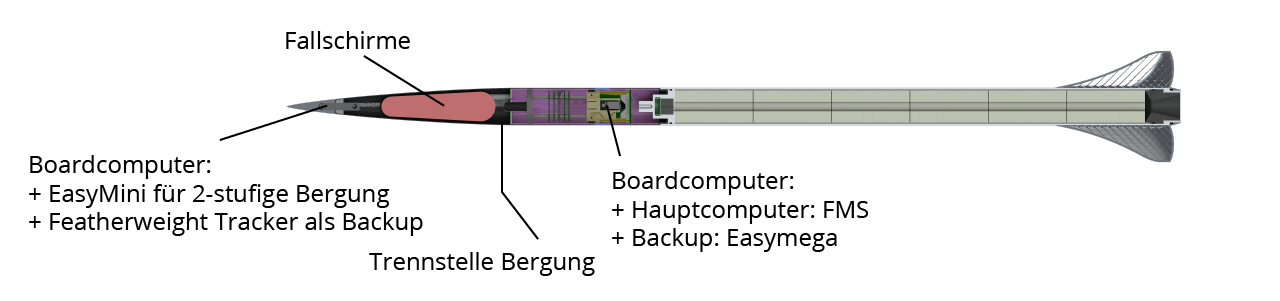 Die Oberstufe wird mit einem zweistufigen Fallschirmsystem geborgen. Der Hauptcomputer (Flight Management System, FMS) erkennt dabei den Gipfelpunkt und trennt die Raketenspitze ab. Als Backup für die erste Bergungsstufe dient ein Altus Metrum EasyMega. Um bei einer etwaigen Fehlfunktion des FMS die Rakete lokalisieren zu können wird ein Featherweight Tracker unabhängig vom restlichen Avioniksystem in der Raketenspitze verbaut.