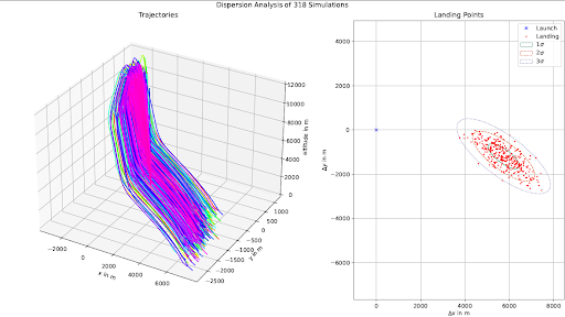Trotz schlechter Wettervorhersage – Regen und bodennahe Winde sowie Wind in Hurrikanstärke auf 10 km Höhe – entschieden wir uns für einen Start. Zur Berechnung von möglicher Trajektorien kam eine neuentwickelte Software zum Einsatz: DIANA ermöglicht eine Dispersionsanalyse auf Basis von OpenRocket. Somit konnten wir die möglichen Landepunkte bei den vorhergesagten Windverhältnisse gut abschätzen und die Startrampe dementsprechend positionieren.