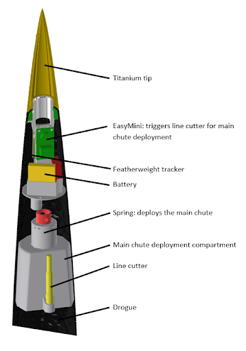 Neben weiterer Tests des Telemetriesystems sollte das neu entwickelte Bergungskonzept in beiden Raketenstufen erprobt werden. Das folgende Bild zeigt den Hauptschirm, geschützt in einer feuerfesten Auswurftasche, die beiden redundanten Linecutter, sowie drei redundante Trennladungen. Diese Trennladungen heben die Spitze (Nosecone) vom Rest der Rakete und geben den Vorschirm frei. Da dies auf einer Höhe von über 10 km geschieht, müssen spezielle Vorkehrungen getroffen werden um auch bei geringem Luftdruck zu funktionieren.