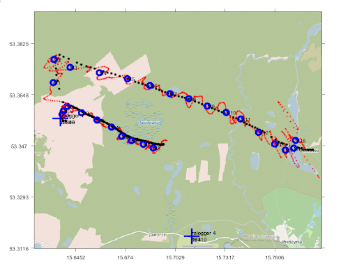 Bild 1: On-Board-GPS-Positionen, Rot: TDoA-Lösung, Blau: Gemittelte TDoA-Lösungen
