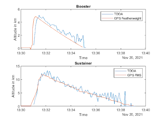 Getestet wurde auch ein Lokalisierungssystem, welches mit Hilfe mehrerer verteilter Bodenstationen die Positionen eines Funkmodules berechnen kann. Das sogenannte Time Difference of Arrival System (TDoA) funktioniert dabei ähnlich wie ein GNSS System. Folgende Bilder zeigen die Flugbahn beider Stufen.